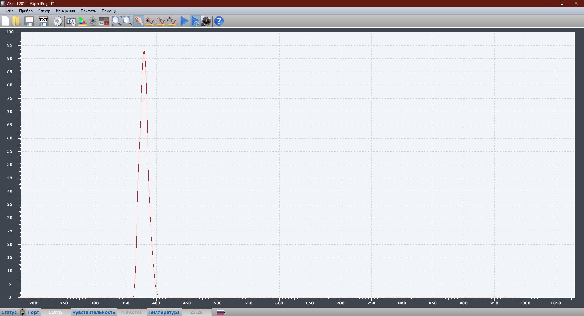 Спектральная характеристика, измерено спектрометром Радуга-300Т c использованием оптоволокна 400 мкМ: