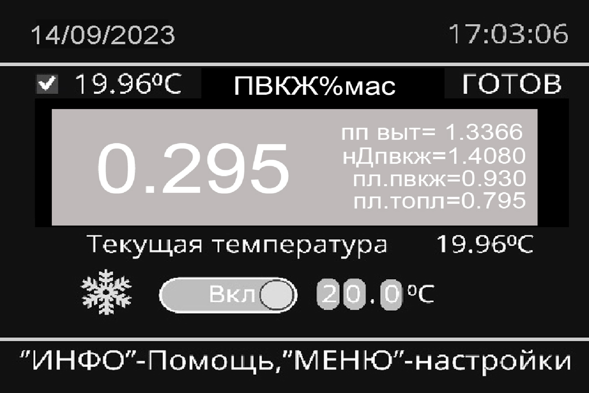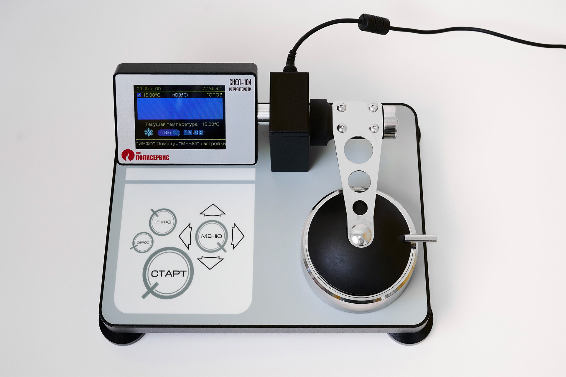 На цветной жидкокристаллический дисплей выводятся результат измерения показателя преломления образца, nD, массовоя доля сахарозы в водном растворе % Brix, температура образца во время измерения, время, дата и серийный номер прибора.