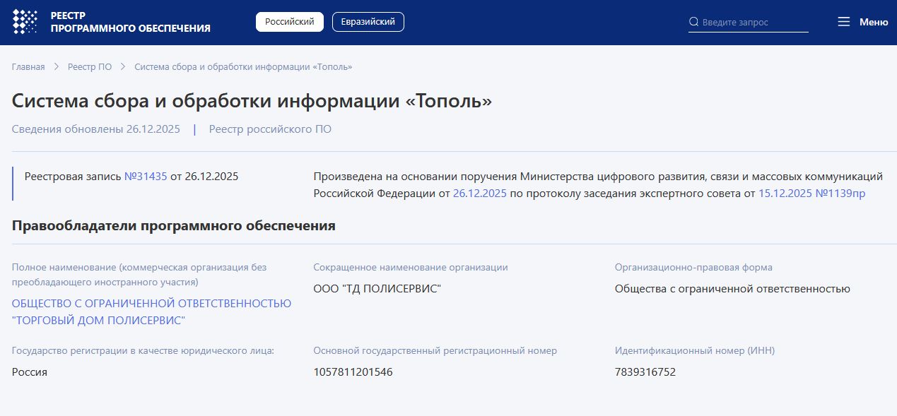 Система сбора и обработки информации «Тополь» включена в реестр российского ПО. Реестровая запись №31435 от 26.12.2025.