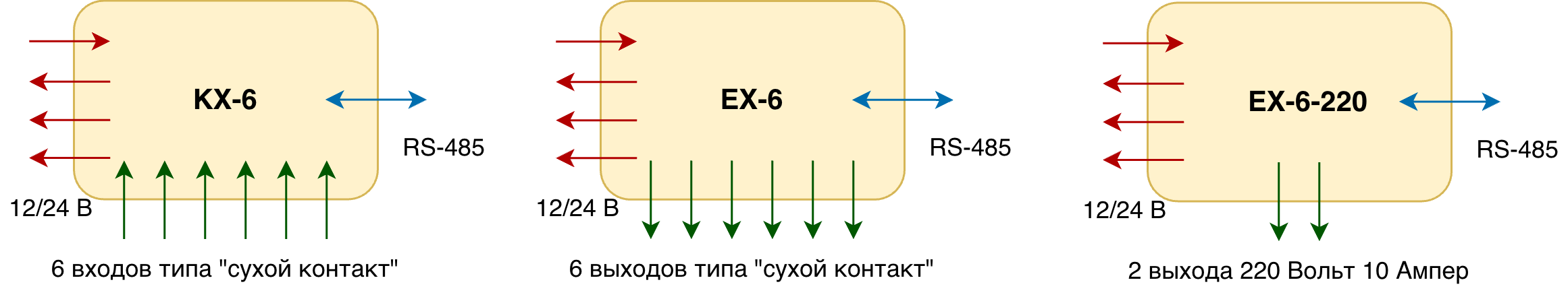 В данной модификации приборы КХ-6 транслируют состояние своих входов в линию RS-485, а приборы ЕХ-6 отображают состояние входов приборов КХ-6 с соответствующими адресами.