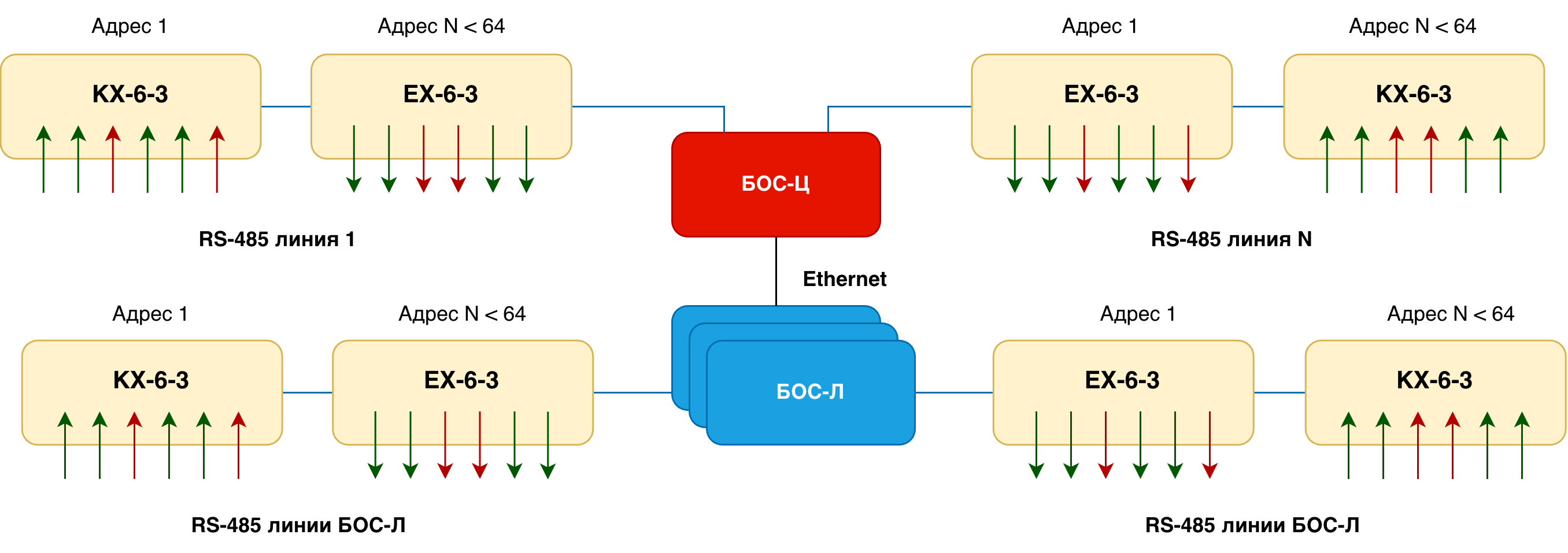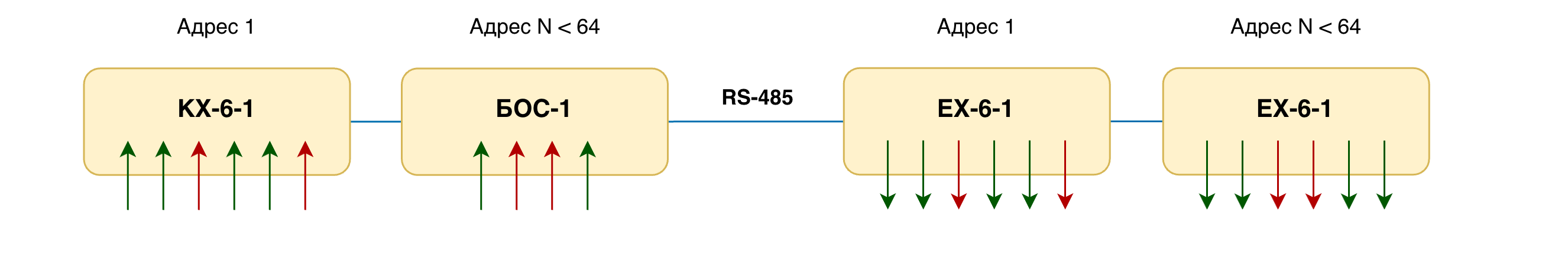 В данной модификации приборы КХ-6-1 транслируют состояние своих входов совместно с блоками БОС-1 в одну линию RS-485, а приборы серии ЕХ-6-1 отображают состояние входов приборов КХ-6-1 с соответствующими адресами.