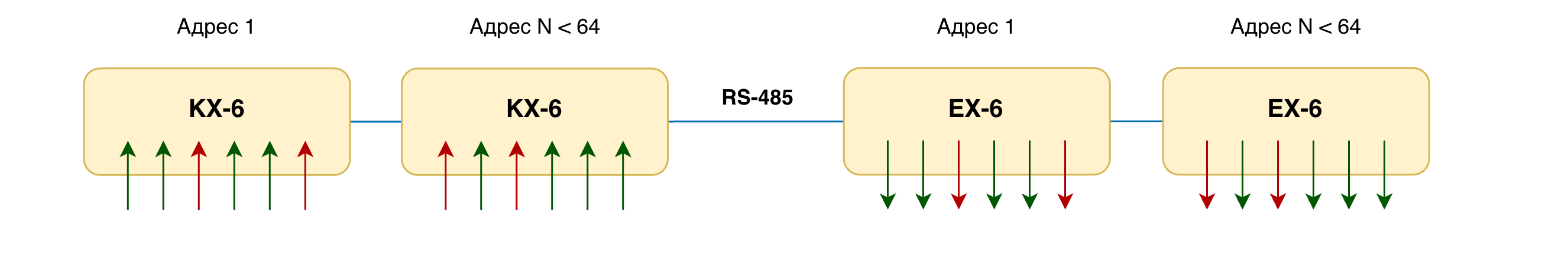 В данной модификации приборы КХ-6 транслируют состояние своих входов в линию RS-485, а приборы ЕХ-6 отображают состояние входов приборов КХ-6 с соответствующими адресами.