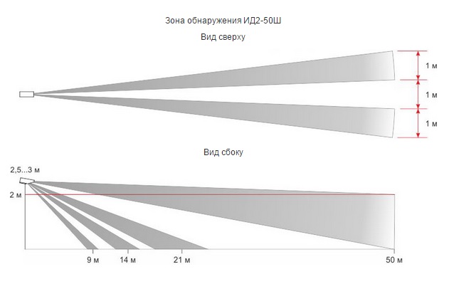 Веерная зона обнаружения - широкий охват, обнаружение "под собой", отличное решение для зон прохода (ворота, калитки).