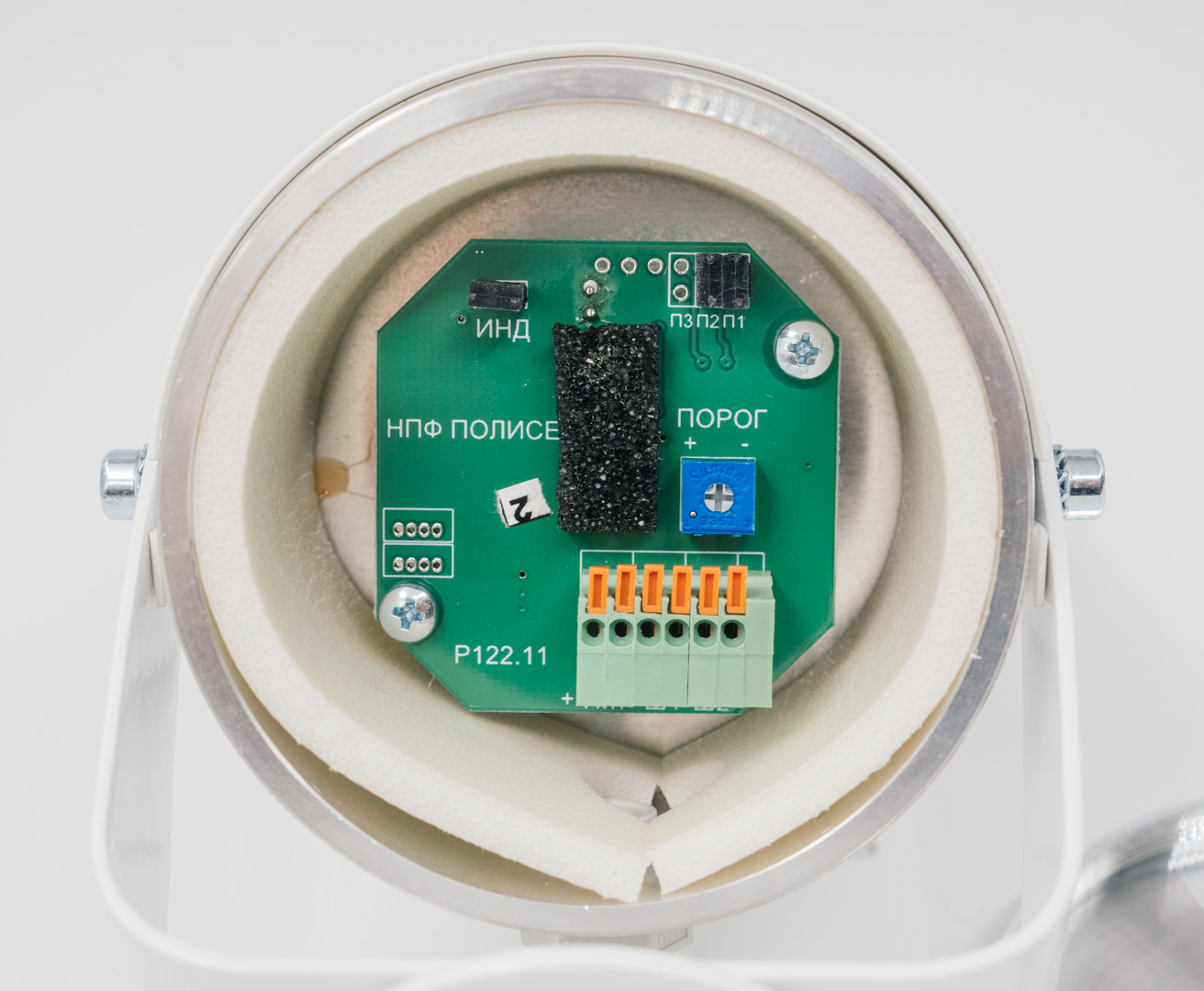 Конструктивно извещатель выполнен в виде разборного (на основание и крышку) алюминиевого корпуса с козырьком, закрепленного на кронштейне, который обеспечивает возможность ориентирования изделия в пространстве относительно горизонтальной и вертикальной осей. Кронштейн закреплен на внутренней стороне угольника с помощью винтового соединения, которое позволяет ориентировать изделие по горизонтали относительно вертикальной оси на угол ±90. Винтовое соединение поз. 4 позволяет ориентировать извещатель по вертикали относительно горизонтальной оси в диапазоне от ±15 до -45 . Внешняя сторона угольника предназначена для установки извещателя на перекрытиях, стенах и других строительных конструкциях зданий и сооружений, а также на технологическом оборудовании с помощью крепления на четыре шурупа. Кабель, осуществляющий питание извещателя и связь с ППК, вводится через кабельный ввод, расположенный в основании. Кабель фиксируется после монтажа к соответствующим клеммным колодкам извещателя. Корпус извещателя состоит из основания и крышки. В торце основания находится линза, являющаяся также оптическим фильтром, защищающим извещатель от паразитных засветок и агрессивных факторов внешней среды. В основании установлена печатная плата с элементами. Извещатель обеспечивает индикацию режимов работы свечением светодиодного индикатора красного цвета, расположенного на плате извещателя. Светодиодный индикатор установлен на плате со стороны линзы. Светодиодный индикатор отображает состояние извещателя при установленной перемычке ИНД. При удаленной перемычке ИНД светодиодный индикатор отключается. Перемычки П1 и П2 позволяют выбрать один из вариантов формирования извещения «Тревога», соответствующий варианту пересечения ЗО. Перемычка П3 не устанавливается и не используется. Потенциометр ПОРОГ предназначен для регулировки чувствительности извещателя. Вращение потенциометра по часовой стрелке уменьшает порог срабатывания (увеличивает чувствительность извещателя). Клеммные колодки (Ш1 и Ш2), расположенные на плате извещателя, предназначены для подключения извещателя к ППК для передачи извещения «Тревога». Клеммная колодка ПИТ предназначена для подключения источника питания.