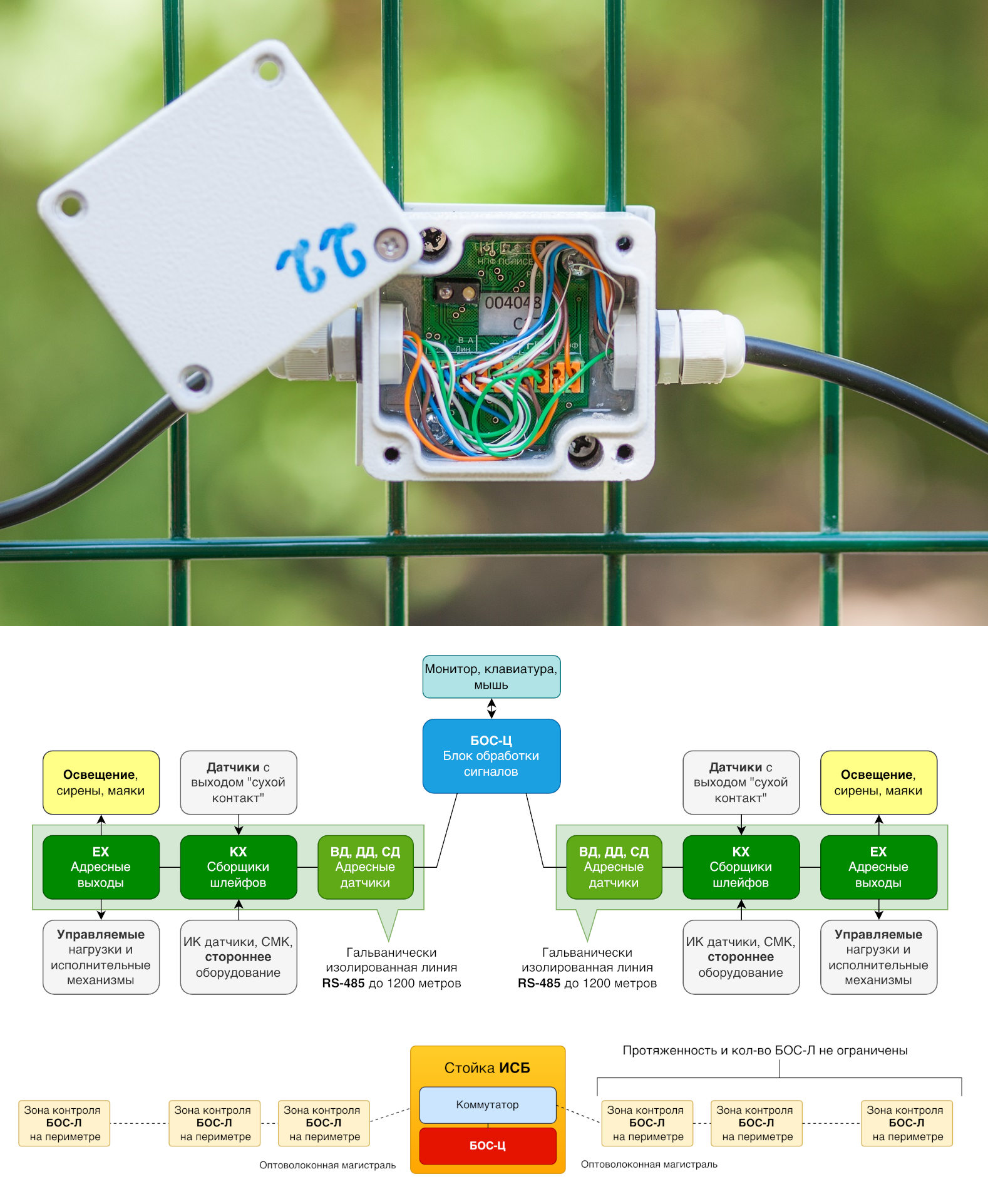 Адресные датчики подключаются к блокам управления по линиям RS-485 как напрямую, так и через оптоволоконные линии связи с помощью линейных блоков обработки БОС-Л, позволяя организовать протяженную и насыщенную систему охраны, используя минимум кабельных трасс.