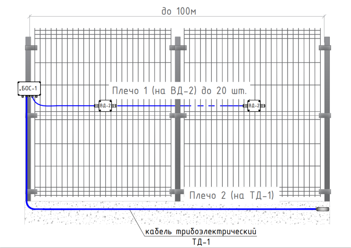 Так-же один извещатель позволяет построить два рубежа охраны в одной охраняемой зоне, например использовать точечные вибродатчики ВД-2 для охраны ограждения от разрушения (перекуса, отгибания и т.п.), а трибоэлектрический кабель ТД-1 от перелаза ограждения подготовленным нарушителем с помощью лестницы: