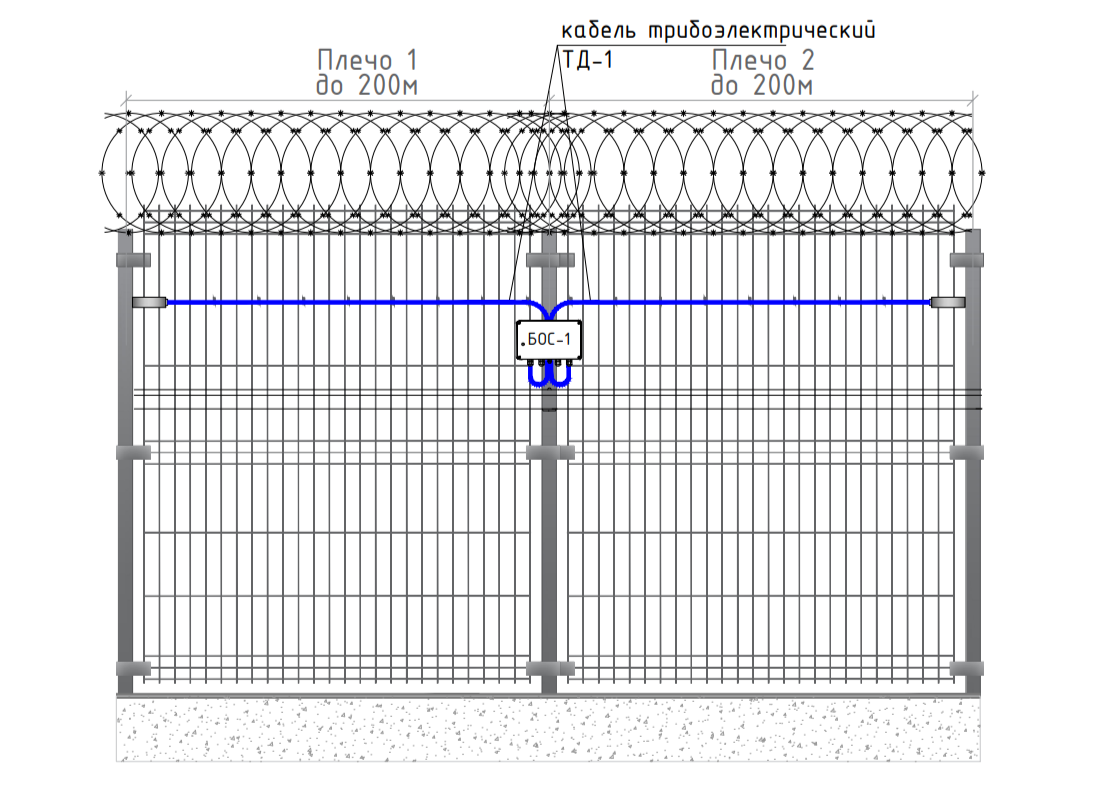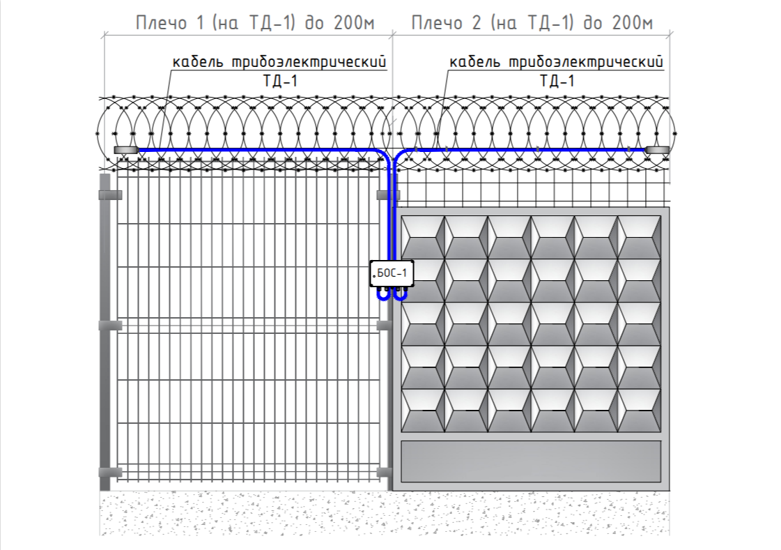 Трибоэлектрический кабель ТД-1 - преобразует колебания ограждения, вызванные нарушителем в момент проникновения на охраняемый периметр, в электрический сигнал за счёт трибоэлектрического эффекта. Кабель является самым дешевым и простым чувствительным элементом - монтаж заключается в креплении кабеля с помощью стяжек к охраняемой поверхности.