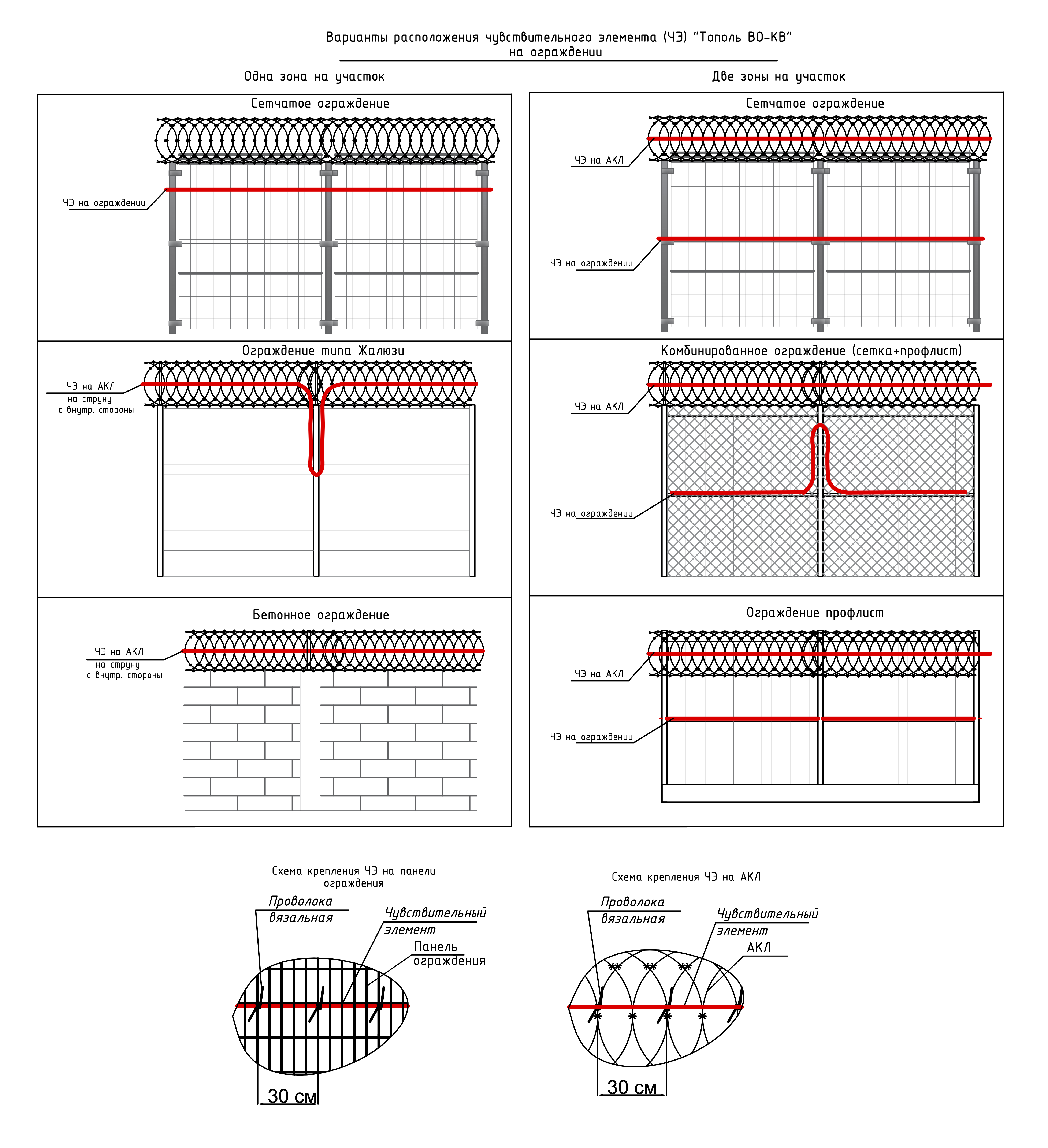 Все варианты монтажа можно комбинировать между собой в одном кабеле для формирования многорубежной системы с использованием одного центрального блока и одного кабеля.